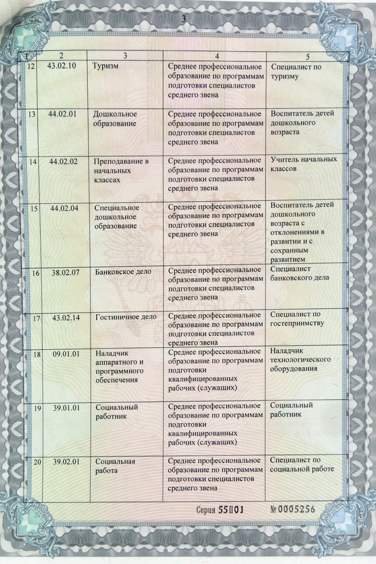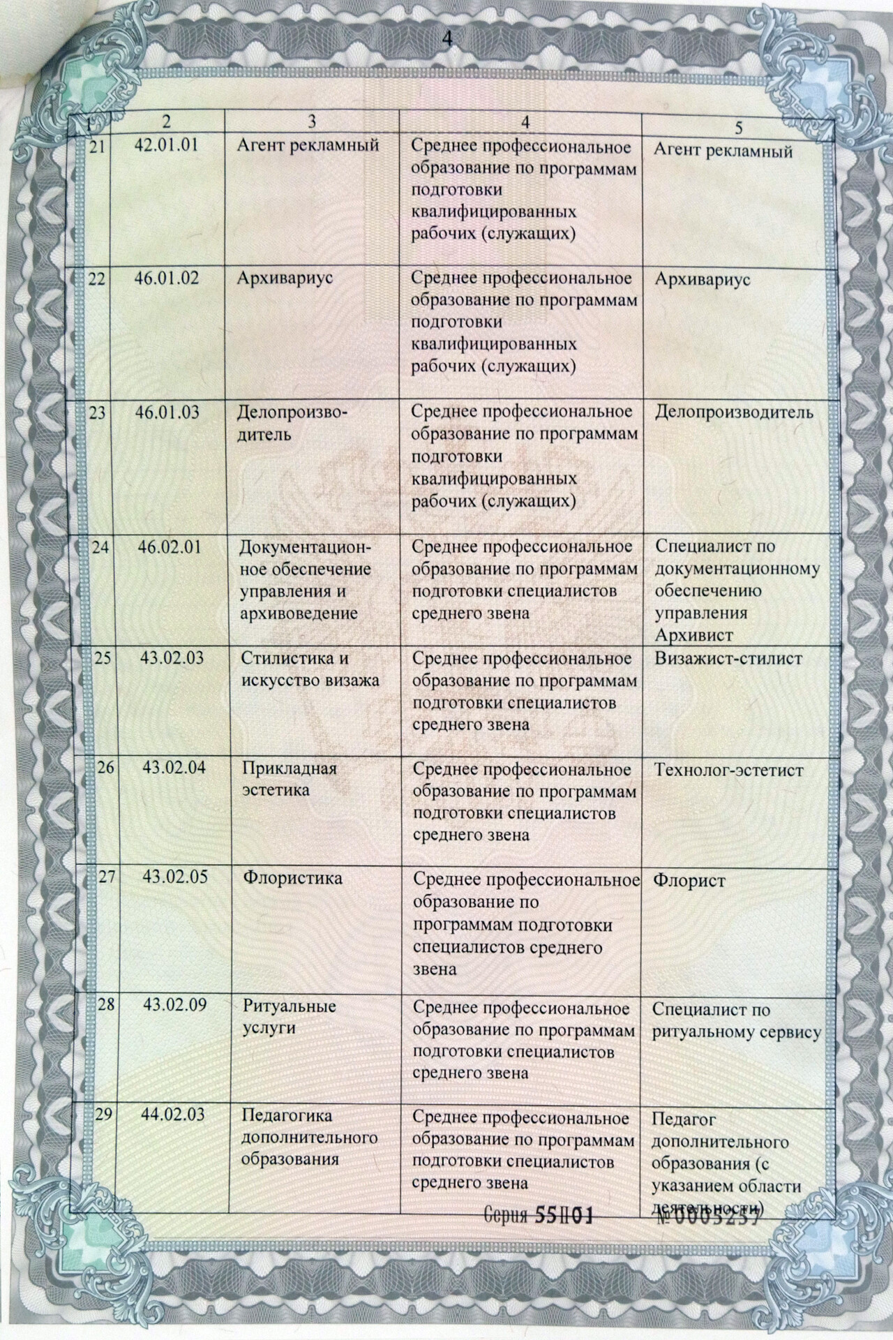 Диплом об образовании: государственный диплом о среднем профессиональном образовании, установленный Министерством образования и науки Российской Федерации.